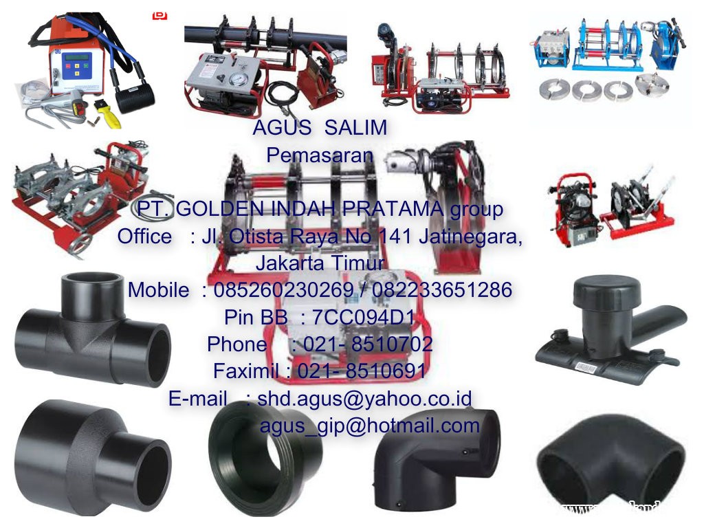 Kami dari PT. GOLDEN INDAH PRATAMA GROUP ( DISTRIBUTORT TUNGGAL) menjual mesin penyambung pipa HDPE yang berkualitas super, barang yang kami jual begaransi Original import wuxi shengda china ( merk BADA ) .yang kami jual fitting, elbow, mesin penyambung hdpe shd